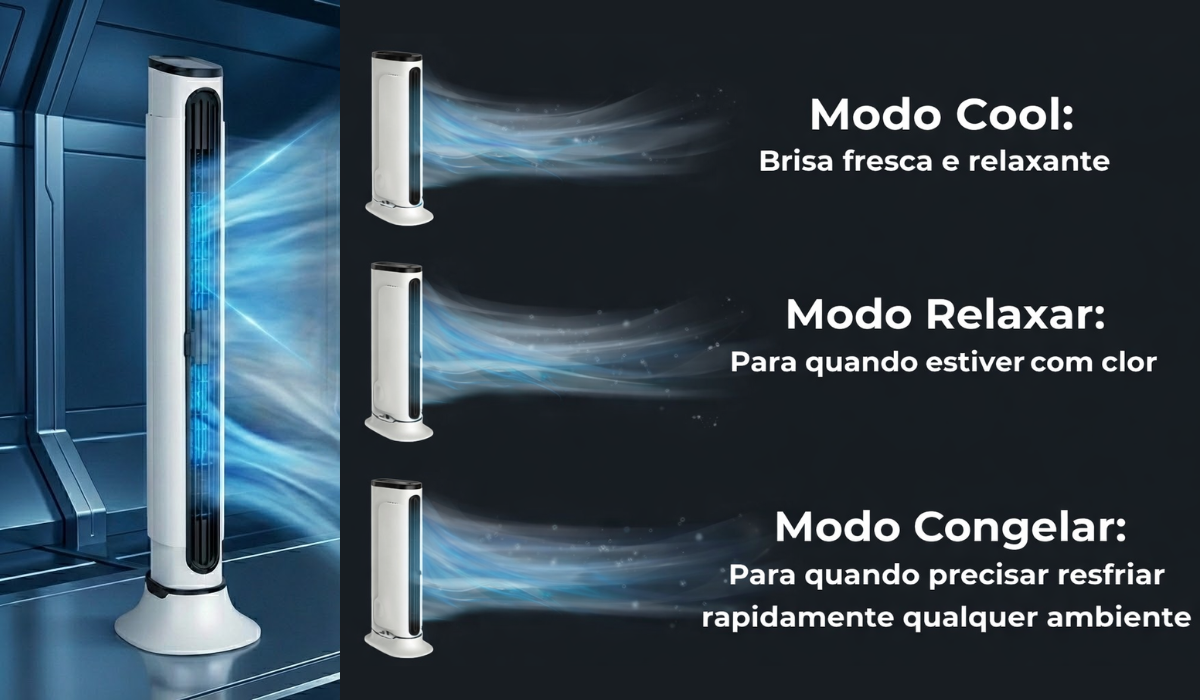 Seu design moderno garante uma operação quase silenciosa, perfeita para quem tem sono leve ou para quem quer um ambiente de trabalho fresco e silencioso.